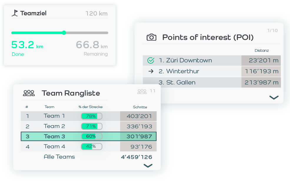 Am Ursprung der nachhaltig erhöhten sportlichen Aktivität eines jeden steht die Motivation. Und was ist motivierender als im Team einem gemeinsamen Ziel entgegen zu eifern? Erstellen Sie eine Route, welche zu Ihrem Unternehmen passt (weshalb nicht auf virtuellem Weg jede einzelne Niederlassung besuchen?), definieren Sie motivierende Etappenziele und erleben Sie, wie jede/r einzelne TeilnehmerIn auf spielerische Weise zum Erreichen des Ziels beiträgt. Dadurch wird nicht nur zu mehr Bewegung animiert, sondern gleichzeitig auch der Teamgeist und das Wohlbefinden jedes einzelnen gefördert. Eine einfache und effiziente Massnahme zur betrieblichen Gesundheitsförderung.